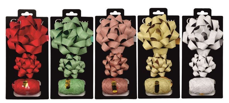 Glitrovaná sada dvou rozet, velikost 10cm a 7,5cm, klubíčko návin 10m. Balení na kartě, viz obrázek. Mix 5 barev: stříbrná, zlatá, červená, zelená, růžová.