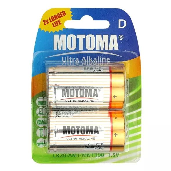 Kvalitní alkalická baterie MOTOMA LR20. Napětí: 1,5V. Průměr / Výška: 34,2 x 61,5mm.V balení (blistr) jsou 2 kusy baterií.Uvedená cena je za 1ks baterie.Jedna krabice obsahuje 12 blistrů / 24 kusů baterií.