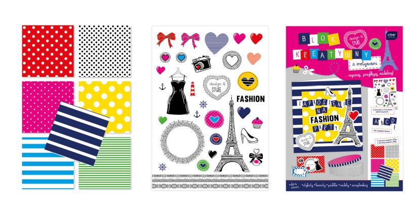 Blok plný kreativní zábavy - papírové oblečení, papírová móda. Pruhované nebo puntíkované barevné papíry, a fashion nálepky k tomu.
