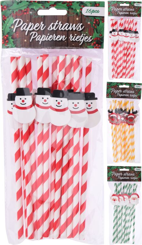 Brčka PÁRTY EKO pevná 16ks, pevná papírová brčka se zimní odzdobou (sněhulák sob, santa), cena za celé balení