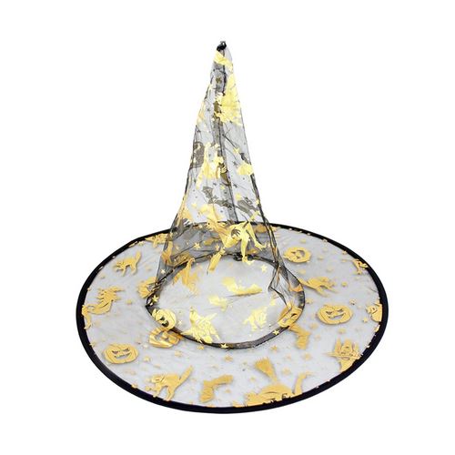 Čarodějnický klobouk s magickými motivy je skvělým doplňkem na Halloween párty nebo karneval! Klobouk je vyroben z černé síťky a je zdoben zlatými obrázky. Staň se hvězdou večírku díky tomuto klobouku!