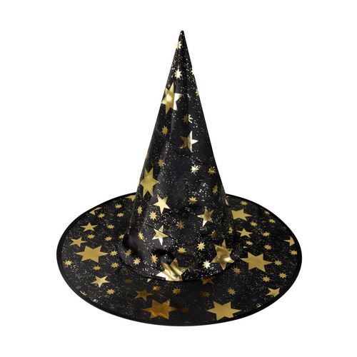 Úžasný čarodějnický klobouk v černé barvě se zlatým potiskem. Ideální i na halloweenský večírek nebo karneval!