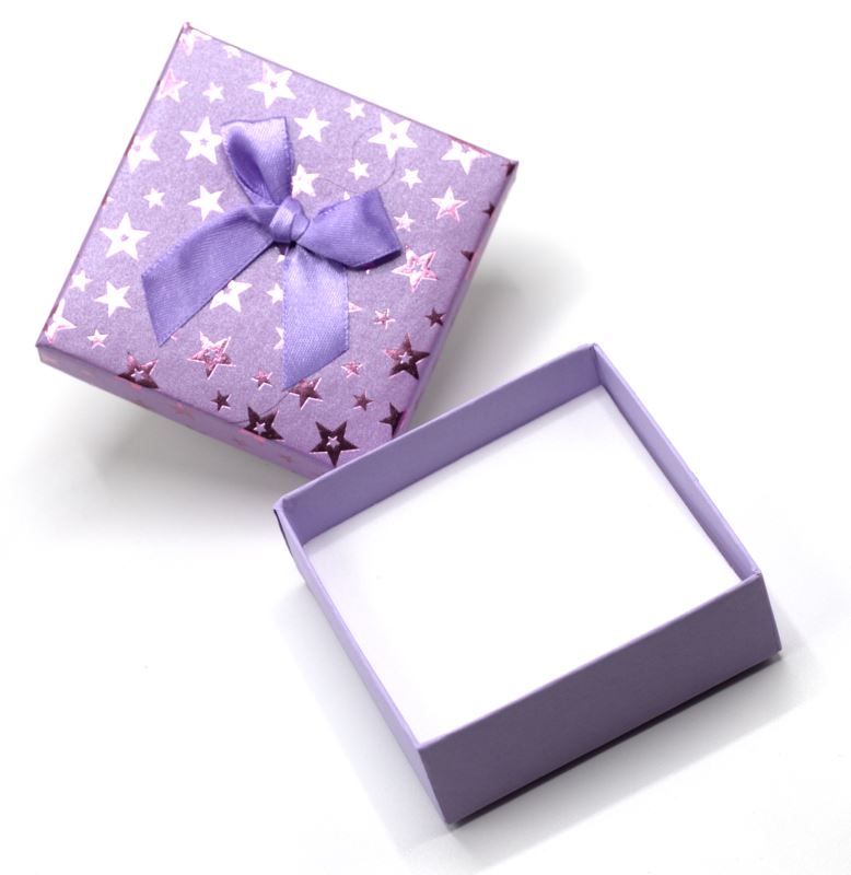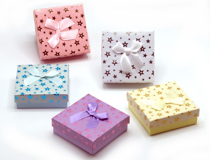 Luxusní malá dárková čtvercová krabička s laserovým lesklým potiskem a textilní mašličkou, vhodná pro klenot, či pro malý dárek.