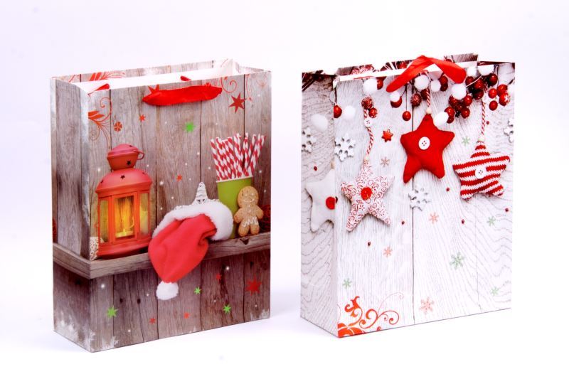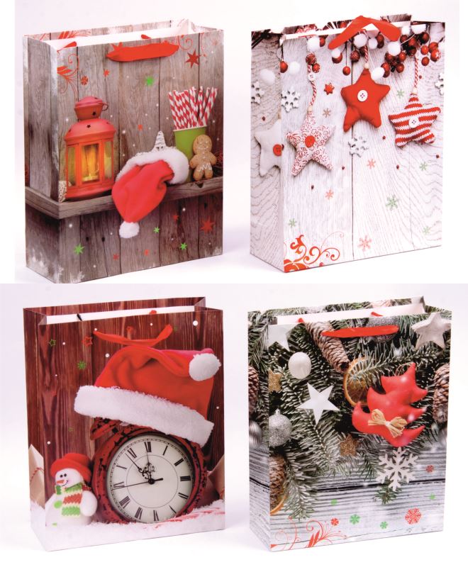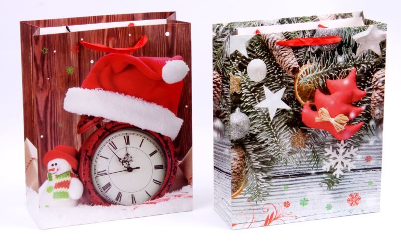 Papírová vánoční dárková taška, tradiční motivy, viz obrázek. Balení 12ks mix, cena za 1ks