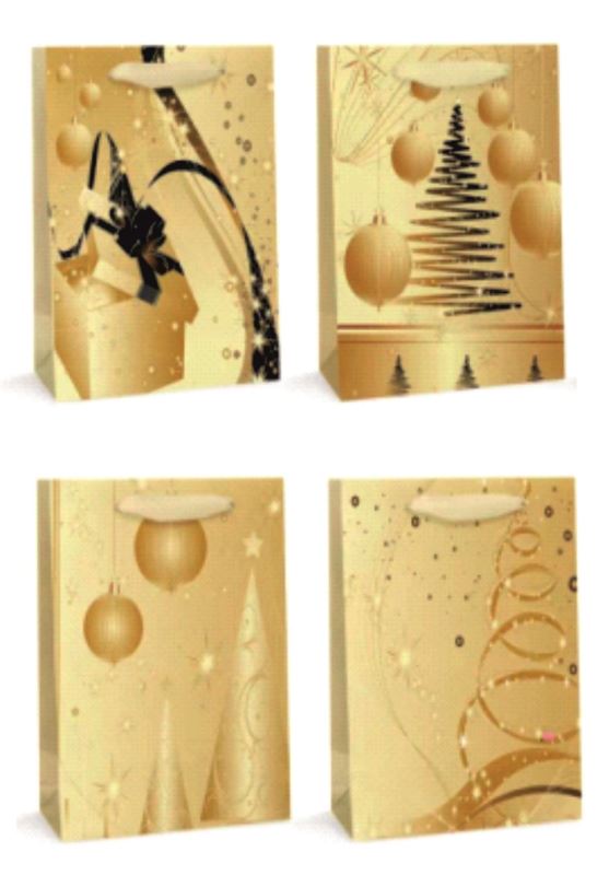 Papírová dárková taška vánoční, luxusní zlatá s tradičními, ale moderními vánočními motivy (vánoční ozdoby, stromek) zlacený tisk, zlaté textilní ucho, mix 4 motivů viz obrázek.