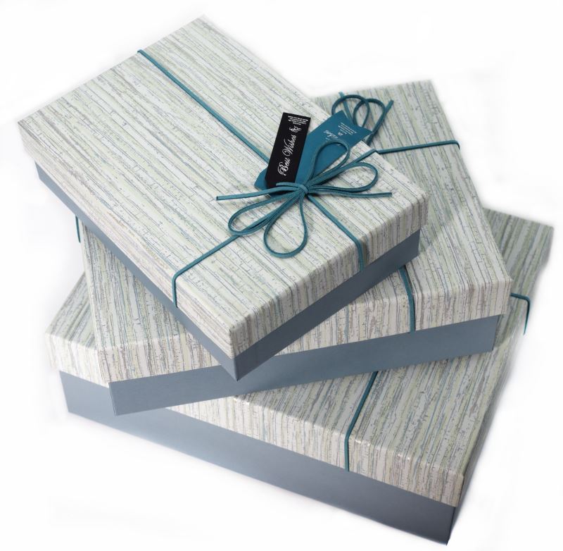 Luxusní set dárkových krabiček v šedém provedení s koženkovou ozdobnou šňůrkou.