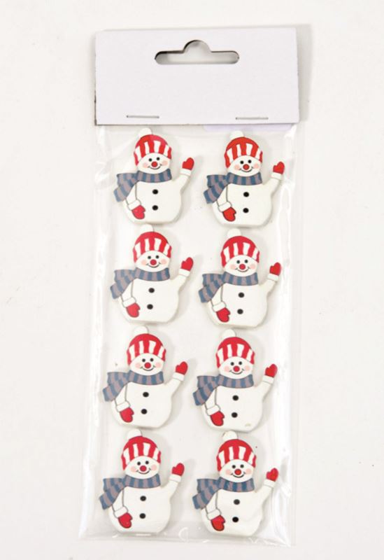 Dřevěná dekorace: 8 kusů zimních samolepících sněhuláků, velikost 4cm, materiál dřevo, barva bílá.