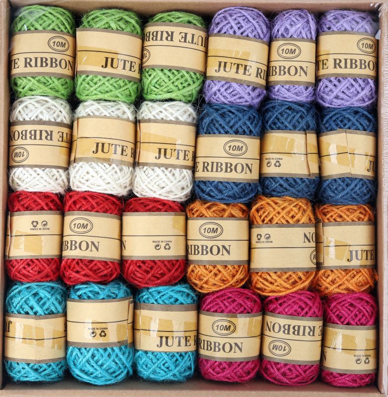 Dekorativní provázek Jutový délka návinu 10m, klubíčko, mix 8 barev - zelená, fialová, bílá, tm. modrá, sv. modrá, červená, oranžová, vínová, balení box 24ks, cena za jedno klubíčko.