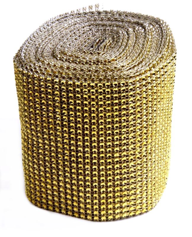 Extra dlouhá - 9metrů - stuha, tvořená zlatými štrasovými kamínky. Vhodná pro výrobu dekorací, nebo jako mašle na dárek.