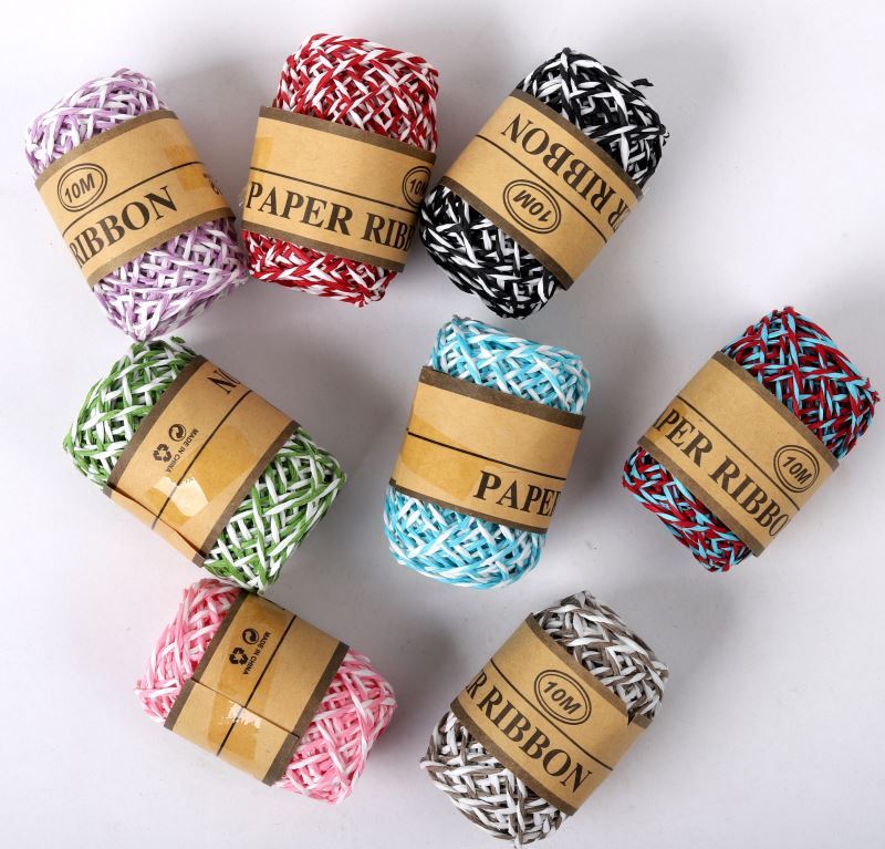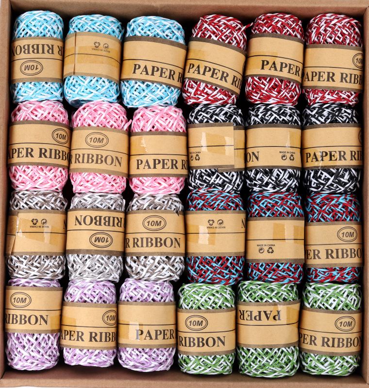 Dekorativní provázek žíhaný papírový 10m klubíčko, mix 8 barev - modrá, vínová, růžová, černá, bílá, vínová, fialová, zelená, balení box 24ks, cena za jedno klubíčko.