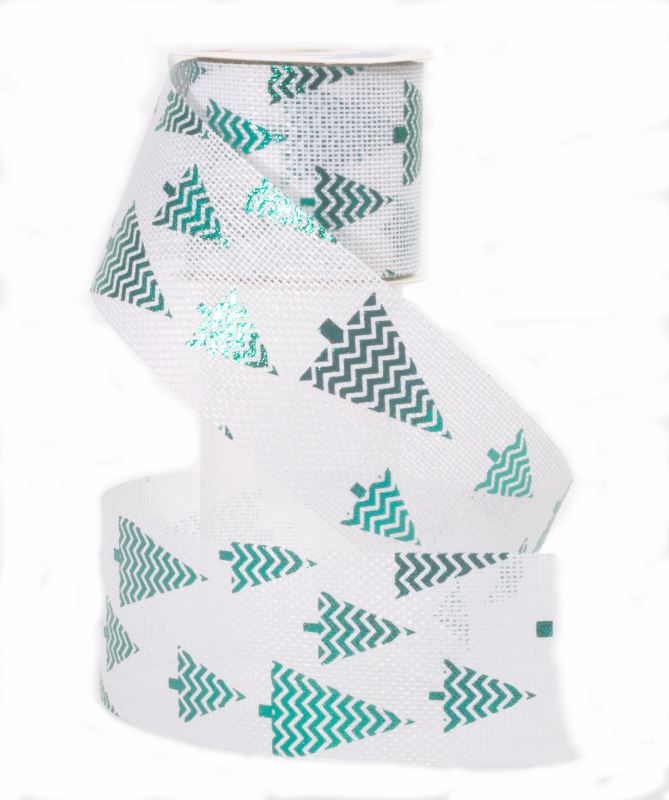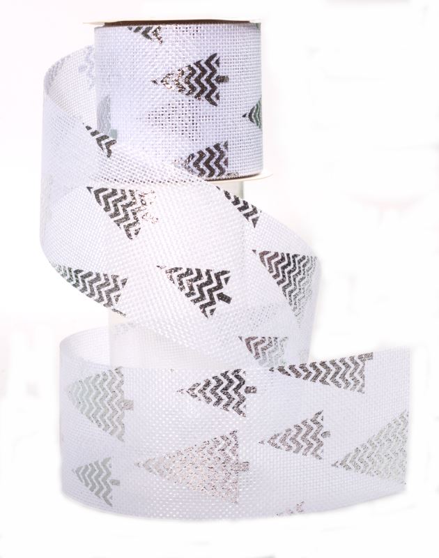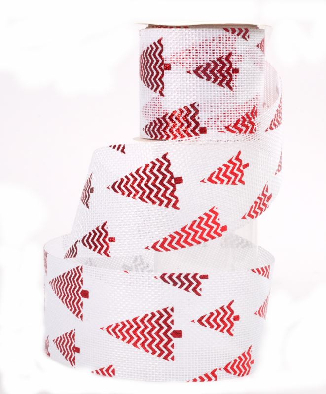 Široká vánoční jutová stuha, bílá s metalickými stromečky, čtyři barvy, červená, zlatá, zelená, stříbrná. Balení 12ks v krabici, cena za jeden návin. Rozměry 6.3cm x 275cm