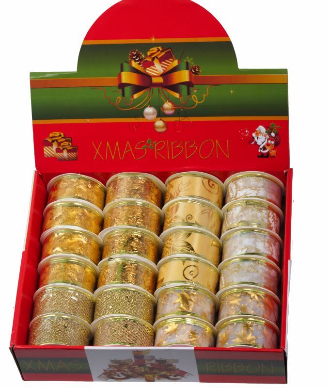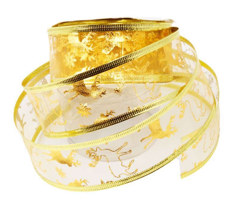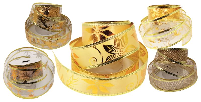 Dekorativní stuha organza zlatá, po stranách tvarovací drátek, v balení mix 6 druhů (s glitry, vánoční motiv atd),VO balení 24ks, cena za 1ks. Vhodné pro ozdobné balení dárků a další dekorování.