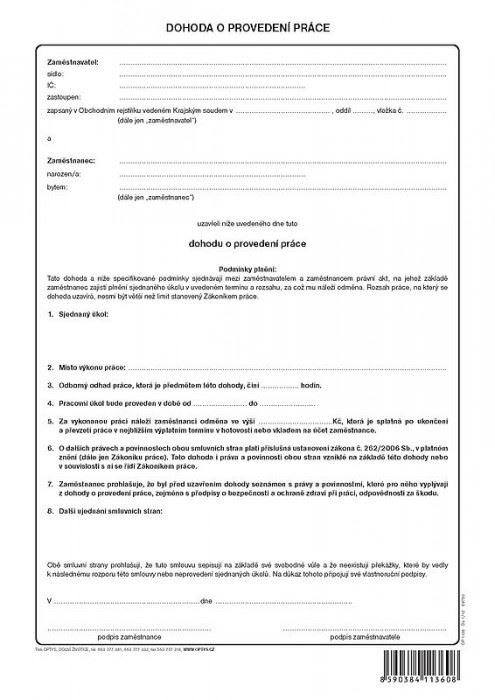 Tiskopis OPTYS, 1136 Dohoda o provedení práce, nepropisovací, nečíslovaná. Tento tiskopis je ve formátu A4 na výšku. Tiskopis je tištěn na papír o gramáži 80g.