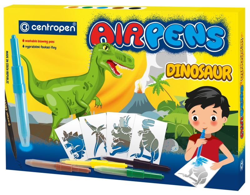 Foukací fixy na papír, zdravotně nezávadný inkoust,snadno smyvatelné a vypratelné, 5 barevných odstínů, 1 černý fix, 8 šablon s motivy dinosaurů,10 archů A4.