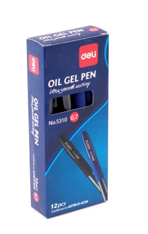 Plastové kuličkové pero Deli 0,7 mm modré, gelové olejové složení (oil gel inks pen). Příjemný a neklouzavý gumový úchop, víčko s klipem. Balení 12 ks v papírové krabičce. Cena za 1ks.