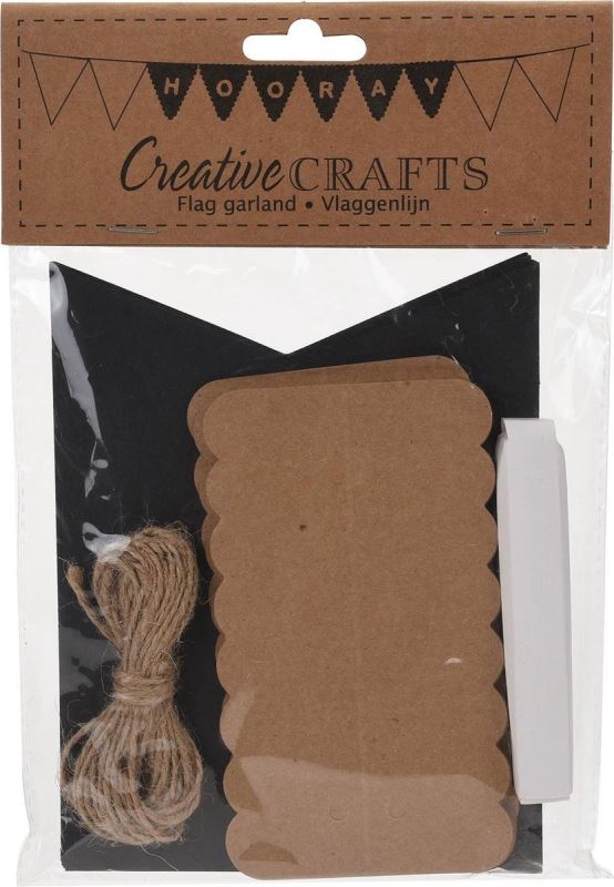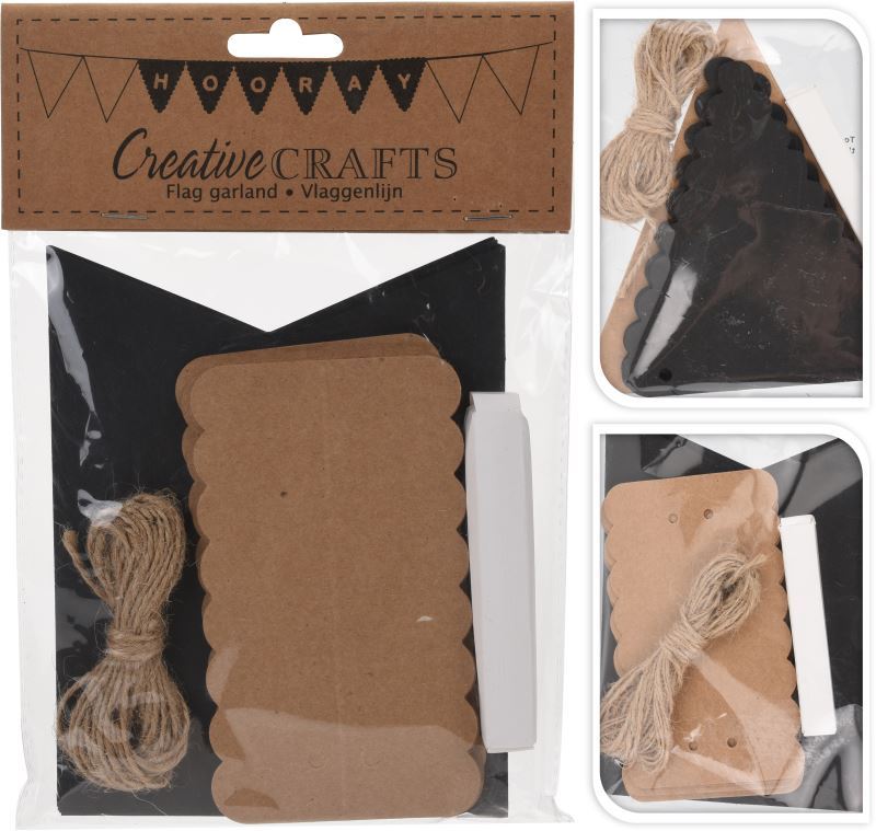 Vytvořte si vlastní slavnostní girlandu z tohoto kreativního setu. V sadě se nachází jutový provázek, černé karty a hnědé kraft karty, bílá křída. Délka 4m.