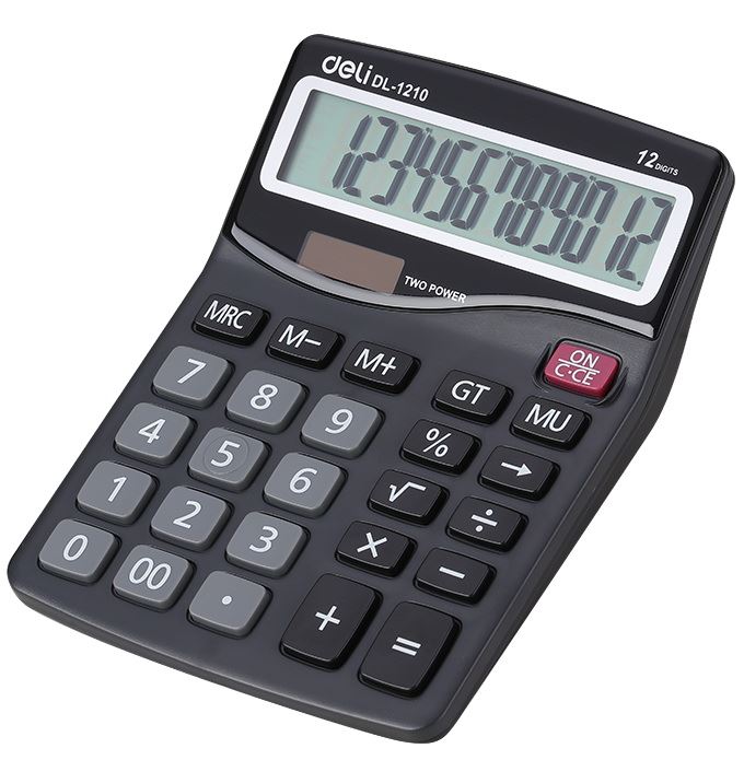 Stolní kalkulátor rozměr 157×120.4×46.2mm, se snadno čitelným, velkým 12-ti místným displejem. Tlačítko na vymazání poslední zadané číslice. Velká tlačítka. Duální napájení - baterie/solární. Baterie není součást balení. Barevné provedení: černá