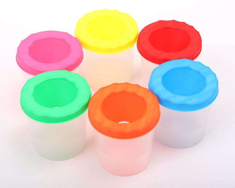 Nevylévací kelímek pro školáky na čištění štětců. Mix 6 barev (zelená, oranžová, modrá, červená, žlutá, růžová) bal 12ks, cena za 1ks.