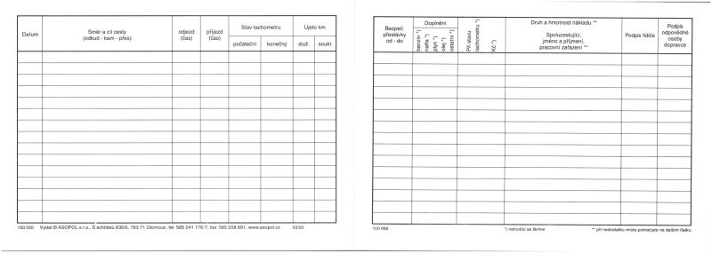 Kniha jízd, firemního vozidla, nepropisovací, formát A5 na šířku, obsahuje 20 listů, bílý papír 80 g, tmavě hnědý oboustranný tisk