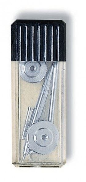 Náhradní díly do kružidel technické řady 700, v plastové tužence jsou narovnány 2 ks rýhované matice, 1 ks kotevního kuželového šroubu, 1 ks držáku jehly, 1 ks jehly s osazením. Zablistrováno 10 ks tuženky s náhradními díly v jednom oddělení tvarové vložky, celkem 3 oddělení, tj. celkem 30 tuženek v jednom balení - blistru.