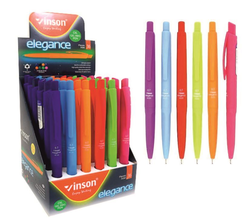 Plastové kuličkové pero Vinson Elegance, gelové olejové složení (oil gel inks pen) mix barev. Balení 36 ks v papírové blistrové krabičce.