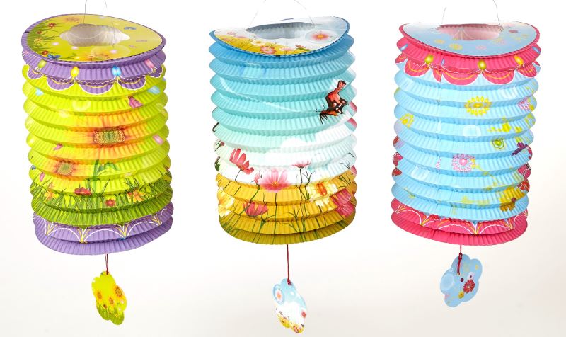 Klasický skládaný papírový lampion ve tvaru válce, průměr 16cm, délka 27cm, drátěný úchyt, držák na svíčku. Mix 6 barev - zvířátkový motiv.