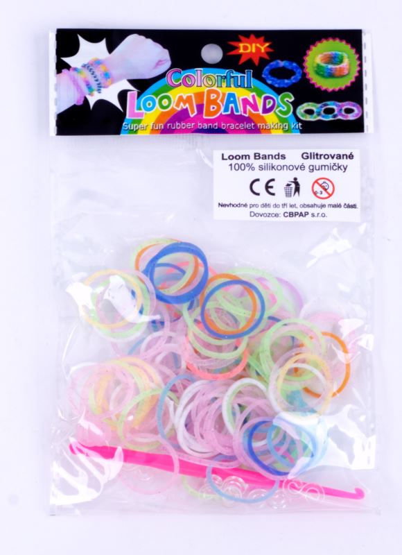 Balení 100ks gumiček + háček a 6ks spojovacích sponek.