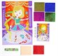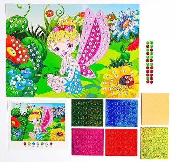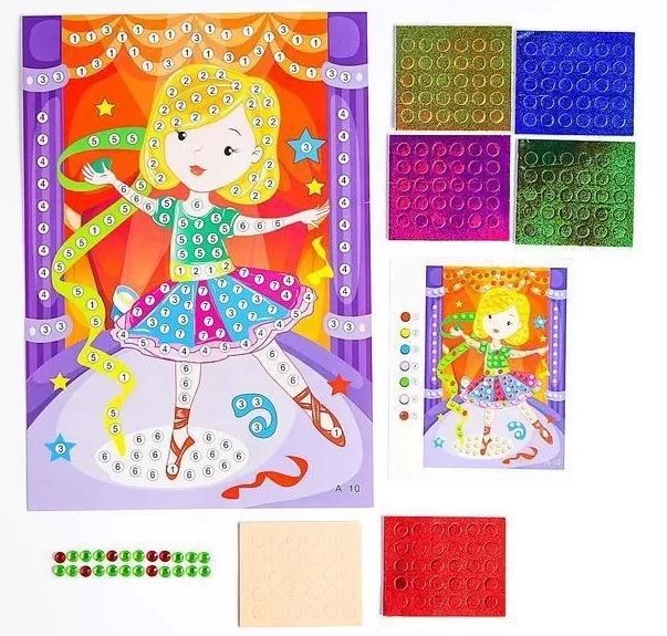 Balení obsahuje předtištěný kartonový obrázek 26x19cm a nalepovací kolečka, papírová, pěnová, kaminky, různých barev, které se dle předlohy nalepují, mix 8 dětských motivů.