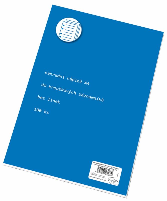 Náhradní náplň do velkých zápisníků s 4 kroužkovou mechanikou.Čistý papír. Rozměry 210 × 297 mm (formát A4) 100 listů