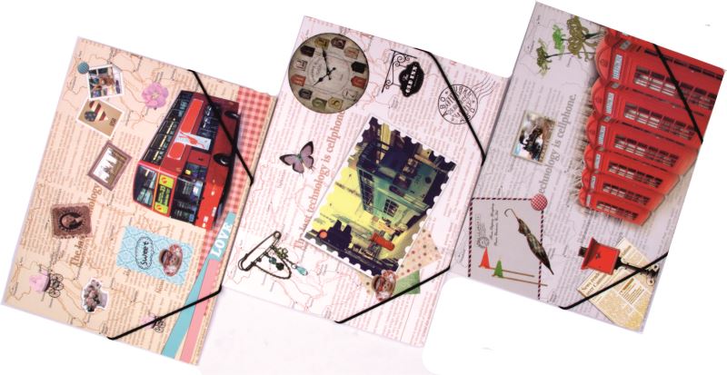 Kartonová odkládací mapa s třemi chlopněmi, uzavíratelná gumičkami, ve formátu A4. Nabízí tři různé barevné designy a je ideální pro třídění a ukládání spisů či dokumentů doma i v kanceláři.