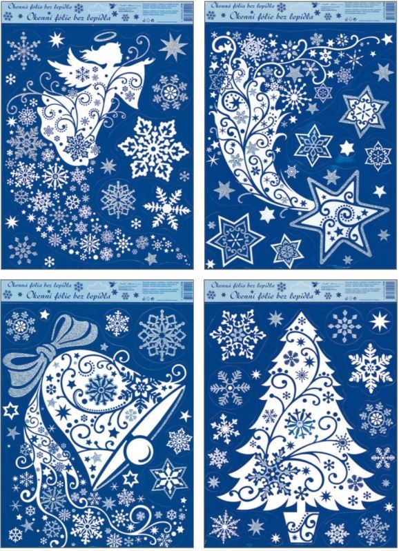 Okenní fólie jemná modrá -- zvon, kometa, anděl, stromek