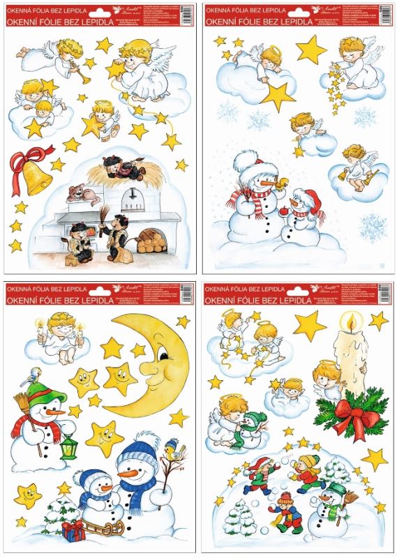 Fólie neobsahuje lepidlo, jednoduše elektrostaticky přilne na čistém okně, zrcadle apod. Mix 4 motivů, cena za 1 arch.