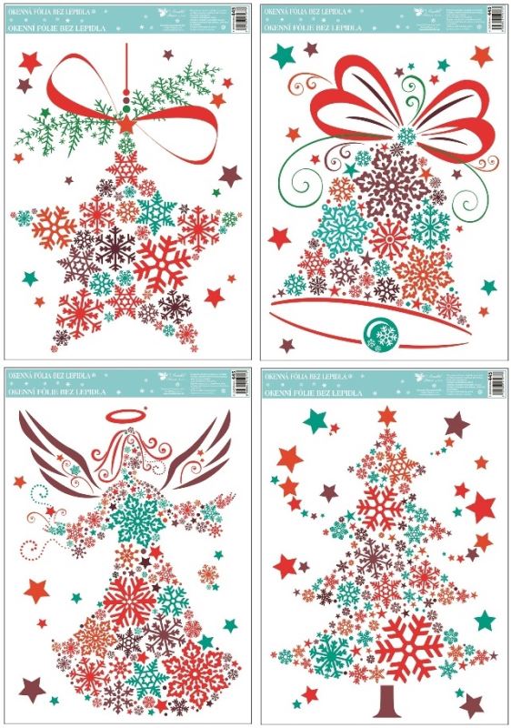 Okenní fólie vánoční barevná,(hvězda, zvonek, anděl, stromek) 33,5x25,5cm