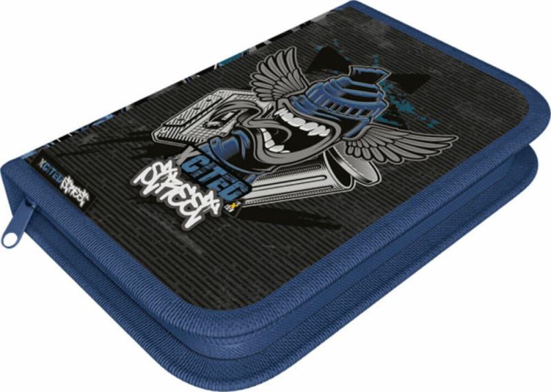Školní penál textilní, jednopatrový (jeden zip) , uvnitř penálu jsou další dvě klopy s gumičkami a úchyty na pera a psací potřeby, gumy, pravítka a nůžky. Rozměr penálu je 195mm x 130mm x 30mm, váha 0,21kg