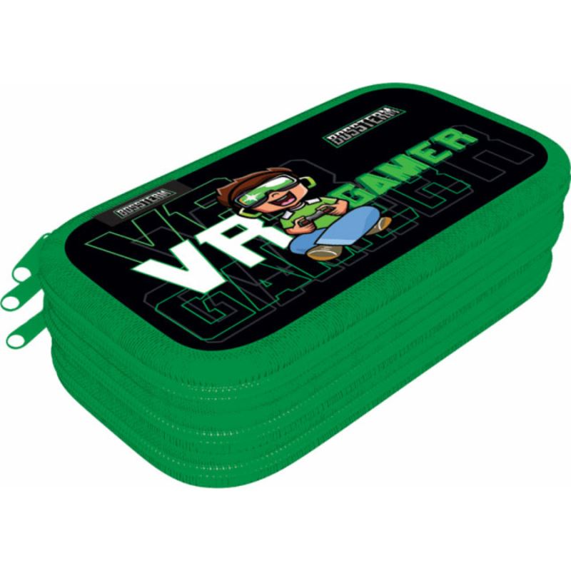 Školní textilní penál třípatrový, 3 zipem oddělené klopy s gumičkami na uložení psacích potřeb, pravítka, pryže, patelek atd.. Rozměr: 20x13x7cm. Vhodný pro školáky.