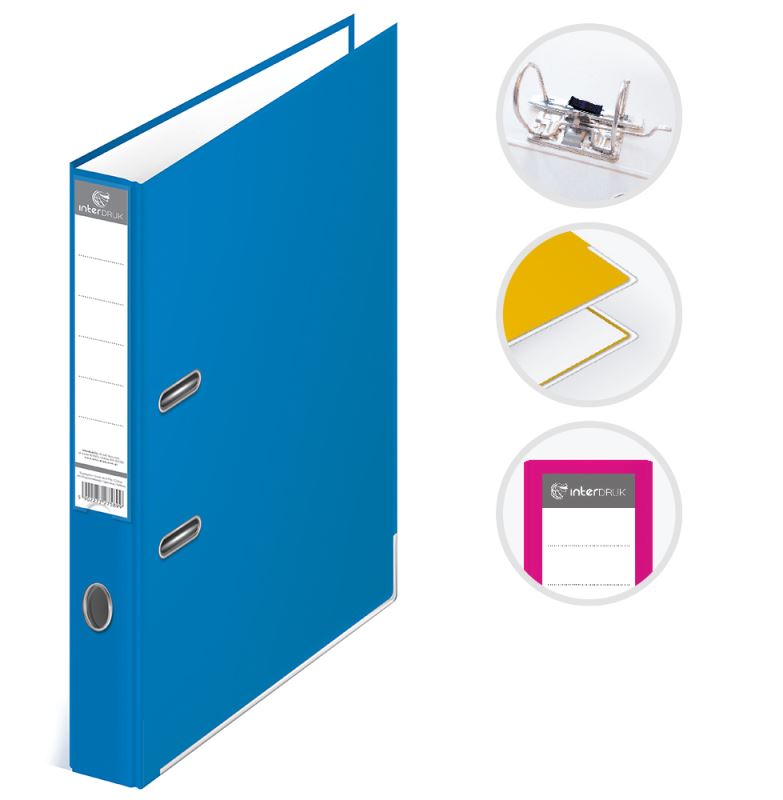 Pákový pořadač formátu A4 Interdruk - vyroben z lepenky, potažen polypropylenovou fólií (100 μm), síla lepenky: 1,9 mm , gramáž lepenky: 1 170 g/m². Vysoce kvalitní páková mechanika s 5letou zárukou. Šířka hřbetu: 50 mm a otvor pro uchopení s vyměnitelným oboustranným hřbetním štítkem. Rozměry: 285x320×50 mm.