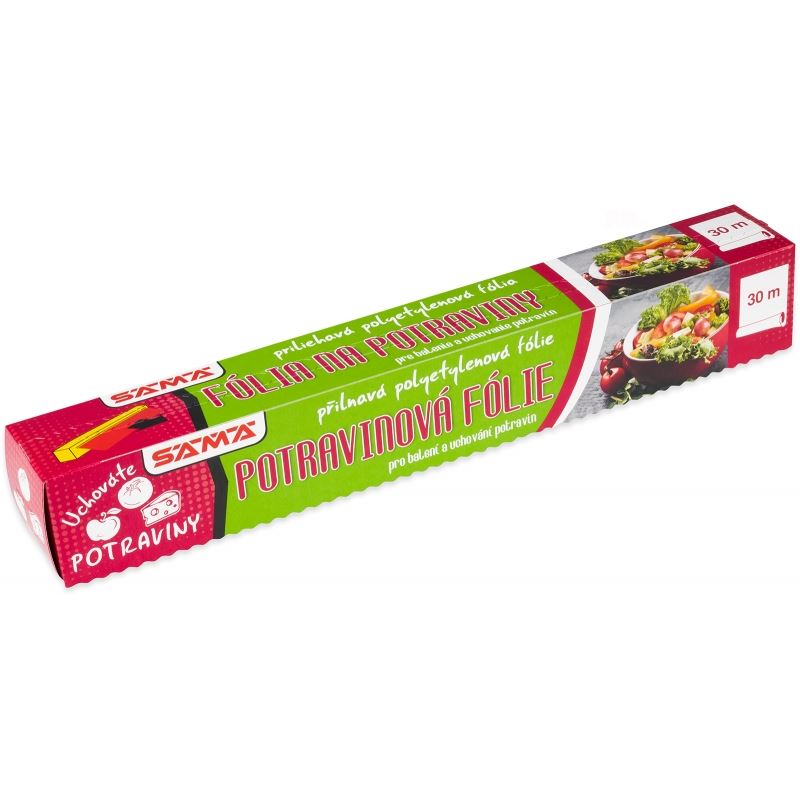Potravinová fólie určená k balení svačin a uchovávání potravin. Vhodná pro kontakt s potravinami, šíře role činí 30 cm a délka návinu dosahuje 30 metrů.