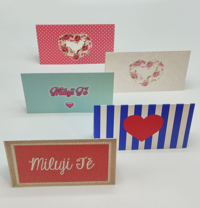 Papírové luxusní přání z lásky, vhodné k vyjádření citů. Mix 5 motivů, viz obrázek (růžové srdce, světlé srdce, srdce pruhy, miluji tyrkys, miluji červená)