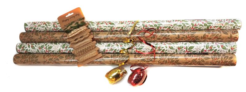 Vánoční balení dárků, nikdy nebylo jednodušší. Sada obsauje 4 role vánočního papíru, každá o rozměru 70x200cm, dvě role jsou kraft a dvě bílé s tradičním vánočním motivem, k zabalení slouží dvě klubíčka stužek o návinu 10m, červená a zlata a sada 6 jutových stuh.