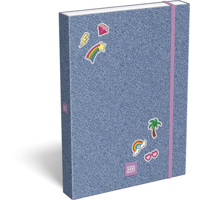Velmi kvalitní box na školní sešity s potiskem, krásný design a barvy. Pevný kartonn, lesklý potisk, k uzavření slouží gumička. Rozměr 330x240x42 mm