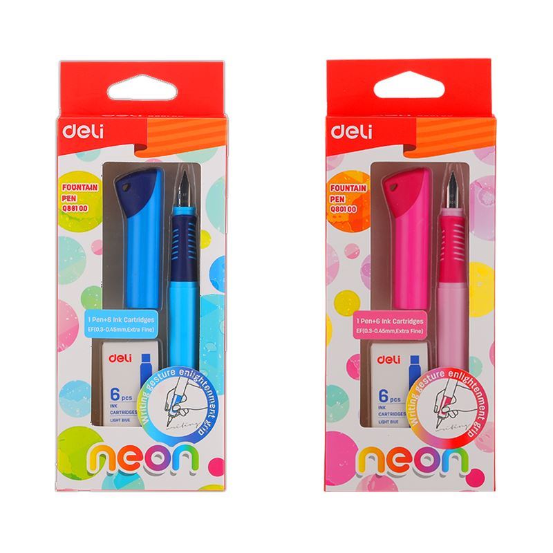 Školní inkoustové pero Deli Q801 Neon + 6ks bombiček
