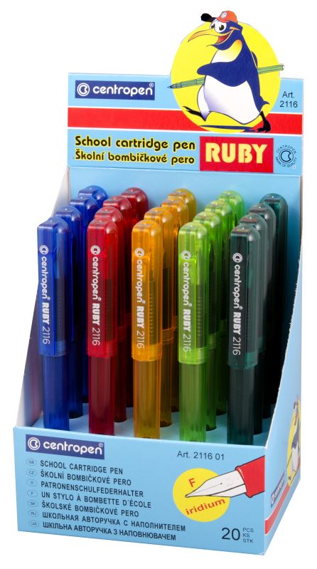 Školní bombičkové pero, modrý zmizíkovatelný inkoust, hrot s iridiovou kuličkou, tenká rovnoměrná stopa písma. Balení 20ks, cena za 1ks.