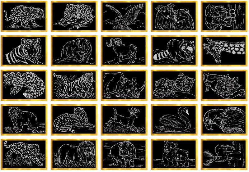 Vyškrabávací obrázky se zlatým podkladem 15x10cm. Vyškrabávací obrázek s různými motivy! Balení obsahuje předtištěný obrázek 5x10cm a rydlo.