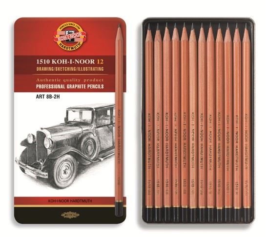 Sada grafitových tužek v přírodním provedení 1512N - 12 ks tužek v plechovém obalu. Šestihranné grafitové tužky v dřevěné cedrové obálce. Olovo grafitu ve 12 třídách tvrdosti 8B - 2H. Třídy jsou přesně dodržovány. Tužky se používají pro grafické designéry a umělce.
