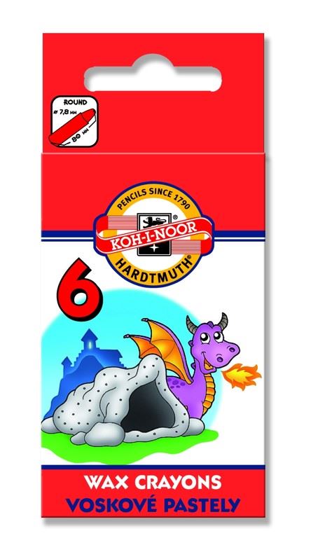 Souprava kulatých voskových pastelů (voskovky), neobsahují toxické ani škodlivé látky, délka voskovky 80 mm, průměr 7,8 mm, balení obsahuje 6 barev.