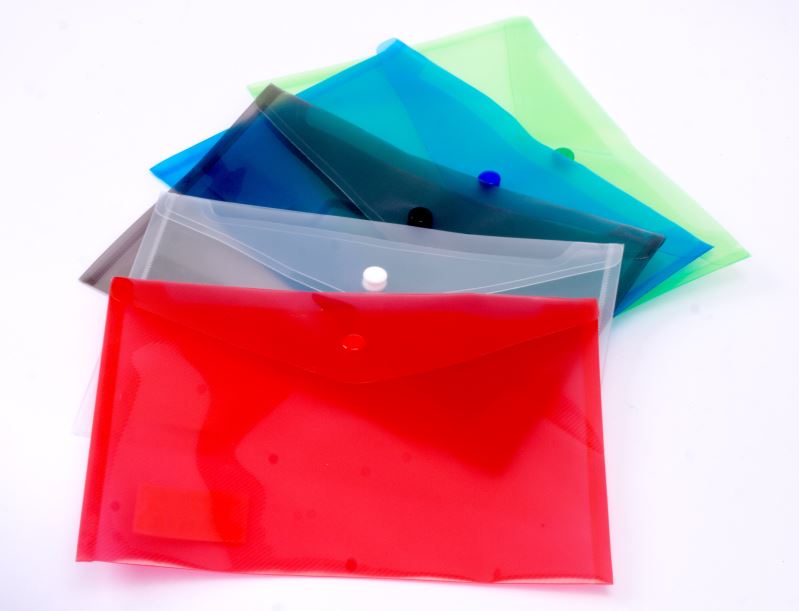 Kapsa s drukem, polypropylen, na dokumenty, pro školáky, studenty i do kanceláří. Balení 10 ks, mix 4 barev, čirá, kouřová, modrá, zelená.