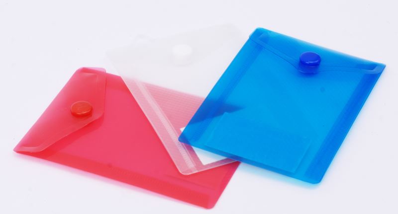 Kapsa s drukem, polypropylen, na výšku, balení 12 ks, mix 3 barev, modrá, červená a čirá. Vhodé na doklady či dokumenty.