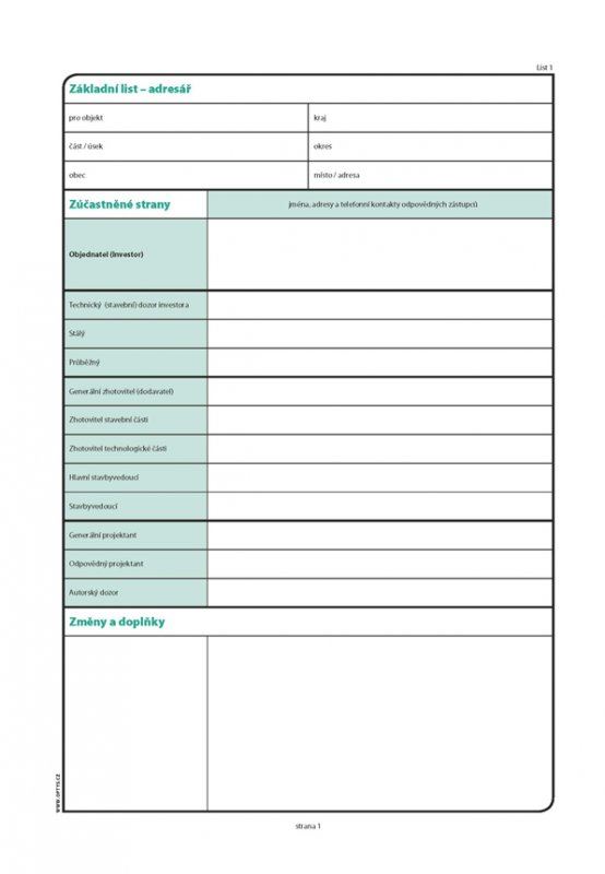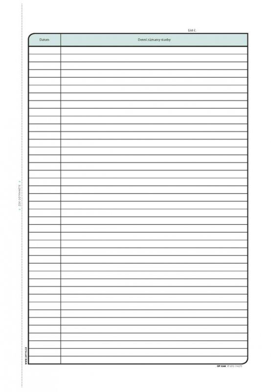 Slouží k dennímu vedení záznamů o všech důležitých skutečnostech od odevzdání staveniště, zahájení až po ukončení stavby, samopropisovací, formát A4 na výšku, obsahuje 3 x 15 číslovaných listů pro denní záznamy + 8 listů pro ostatní důležité záznamy.