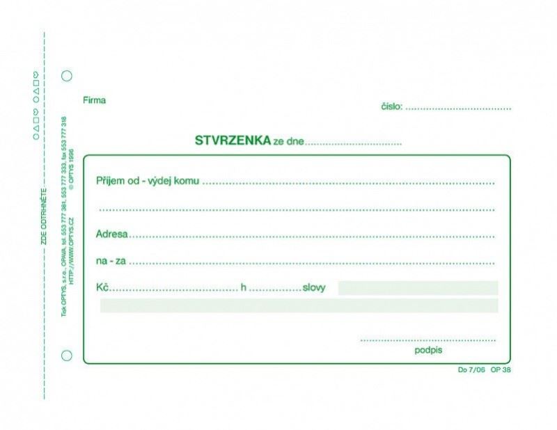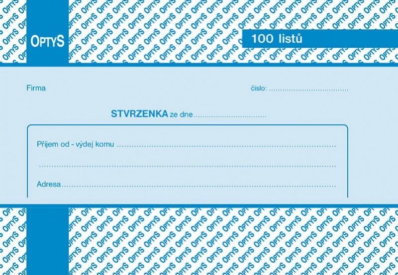 Stvrzenka R OP 1038. Nepropisující tiskopis. Blok 100 listů. Formát A6. Modrá obálka. Nečíslovaný.