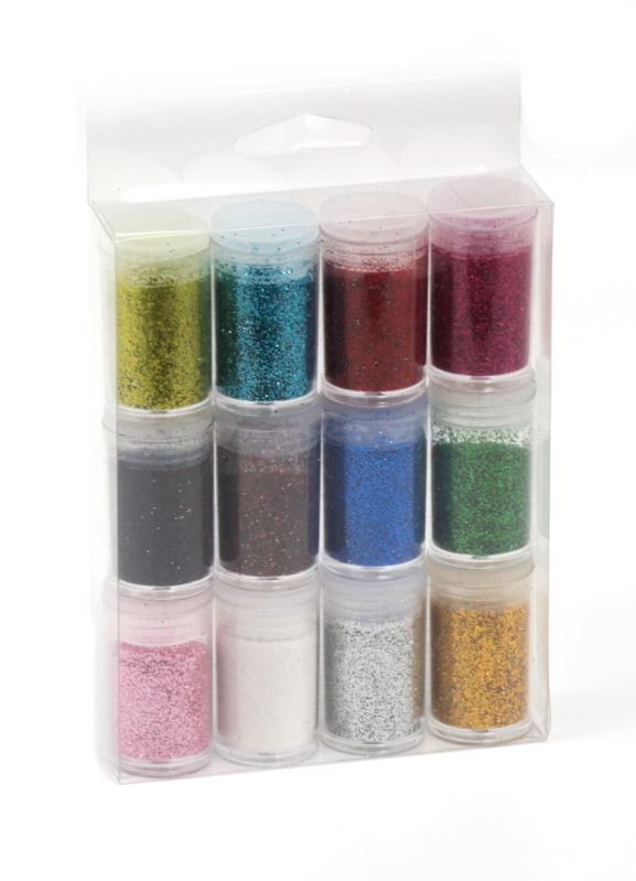 Sypké glitry (třpytky) v sadě 12ks, 12 barev v kelímkách (bílá, černá, hnědá, sv. růžová, tm. růžová, sv. modrá, tm. modrá, sv. zelená, tm. zelená, červená, zlatá, stříbrná). Vhodné pro dekorativní tvoření, nalepování, přimíchávání a jiné.. Cena za celé balení.